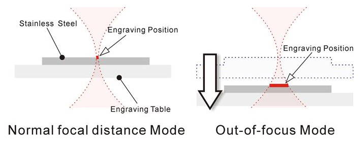 Чтобы получить желаемые черные эффекты, используется техника вне фокуса, которая позволяет держать фокус от материала, что снижает пиковой мощности и предотвращает повреждение поверхности металла лазером.