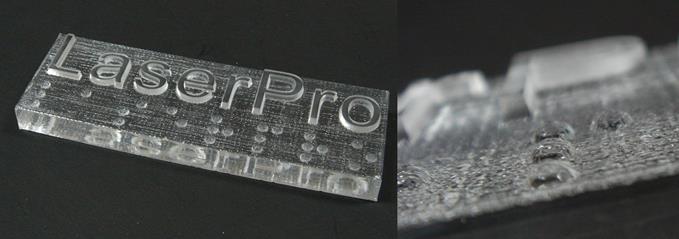 | Model: All Co2 series Material: Acrylic Industry: Personal Product The Braillesystem is a method developed by a Frenchman named Louis Braille and is widely used by blind people to read and write. Through using tools of slate, stylus and the Braille typewriter, different combinations of dot matrices are created to represent textual characters of the writing system. By touching these different combinations of dots, blind people can read and communicate by distinguishing and assimilating varied matrices. Manufacturers may encounter with requests to produce various Braille system related applications; practically, it is actually quite straightforward to apply laser engravers to accomplish these tasks. Generally manufactures will first take a black layer and construct a white dot in the centre; this will produce a raised effect of the engraved dot. However, this method generally creates dots with sharp edges that may injure the blind when they touch the dots. In view of that, the LaserPro application lab has found a very good solution to resolve this dilemma. |